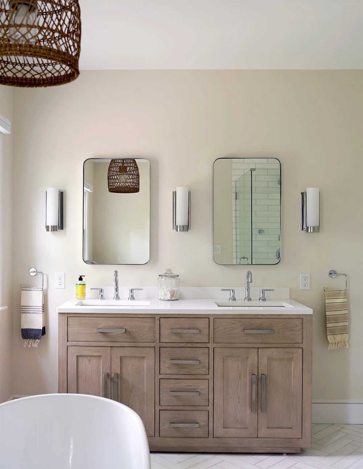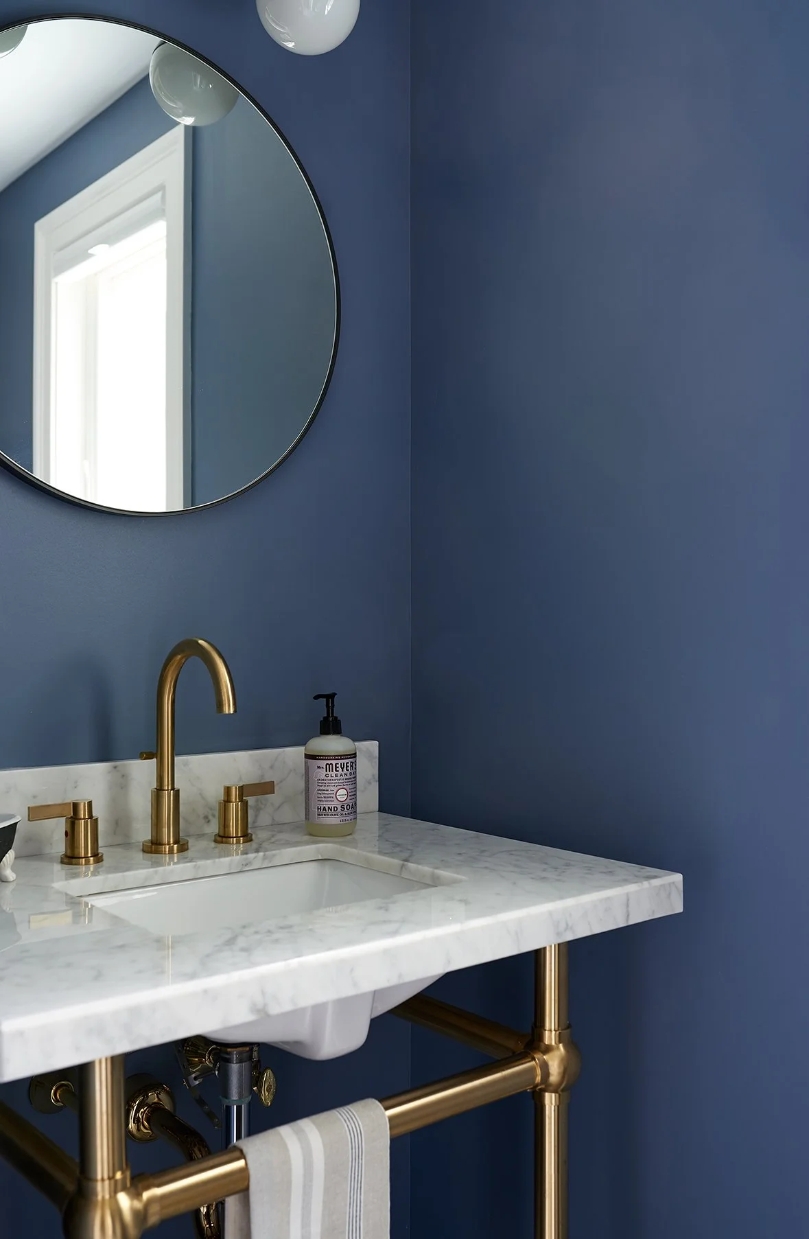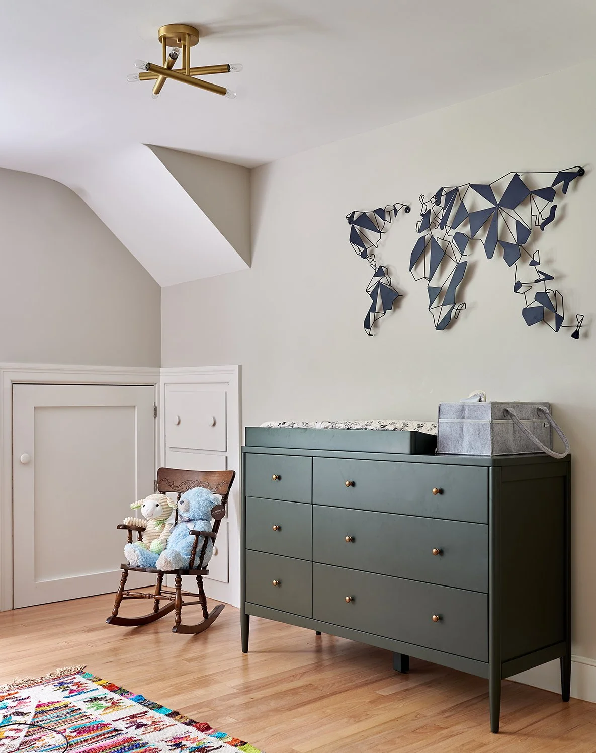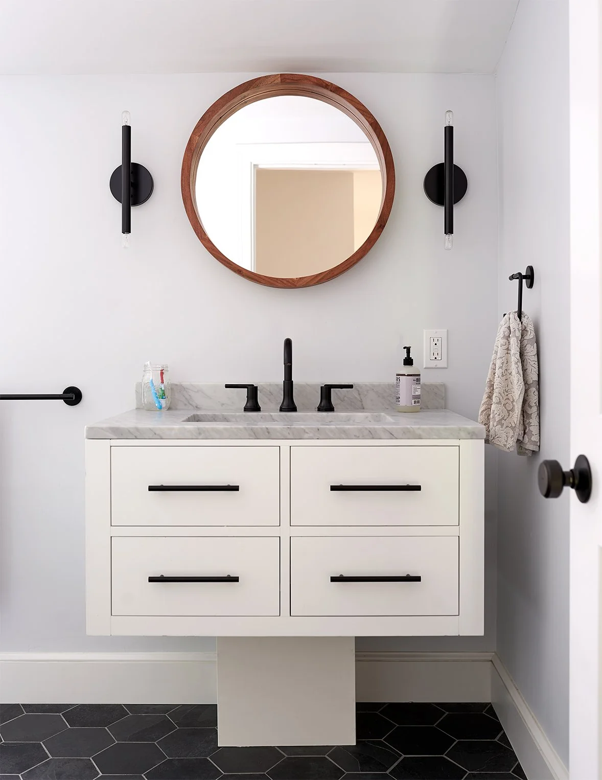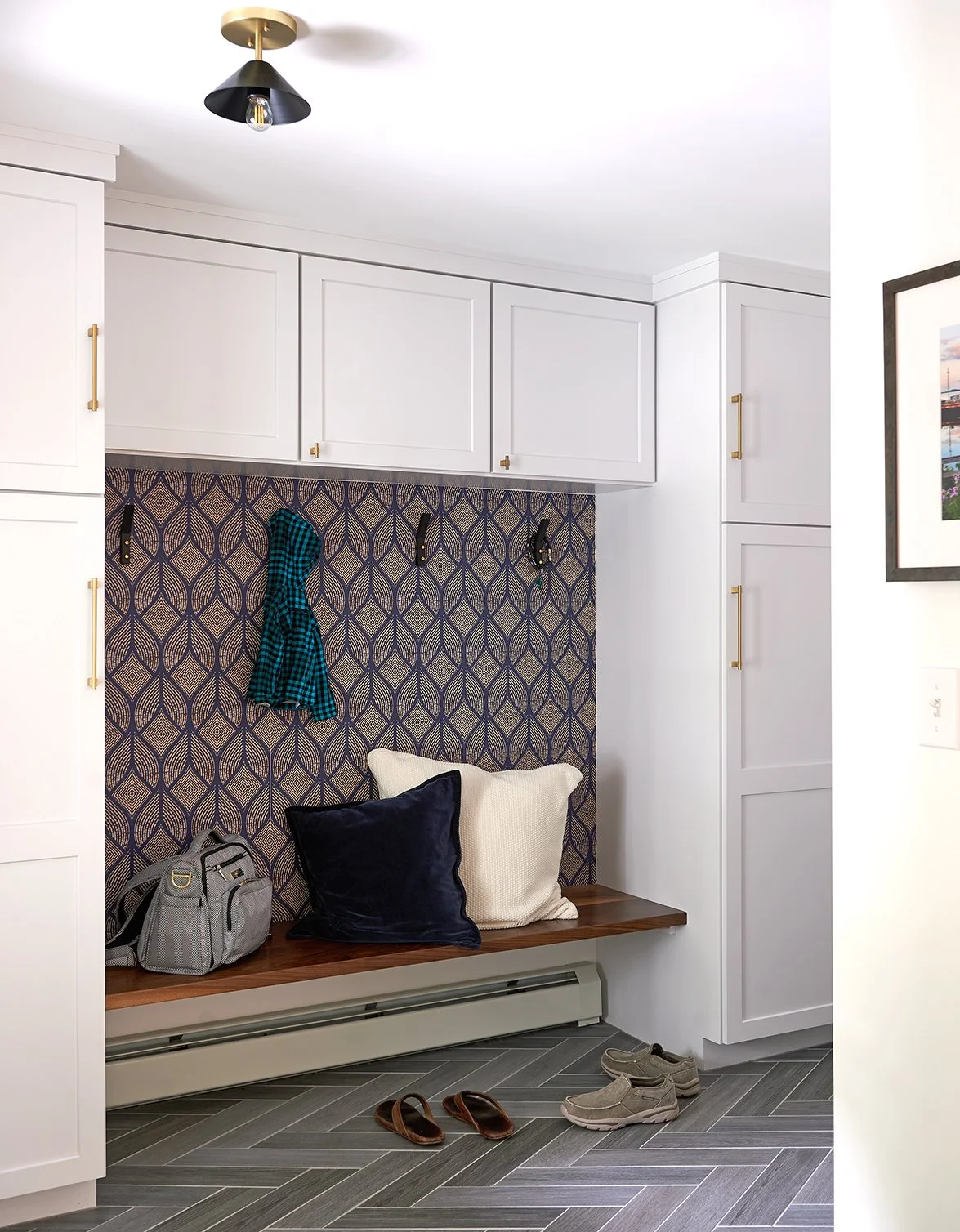 In close consultation with the homeowners, art-deco patterns, like geometric wallpaper and a Chevron tile backsplash, add retro flair, while an unadorned mantel, marble bathroom vanities, and black, white, and gold accents elevate the look throughout. Upstairs, patterned tilework echoes the first-floor’s art-deco influences.